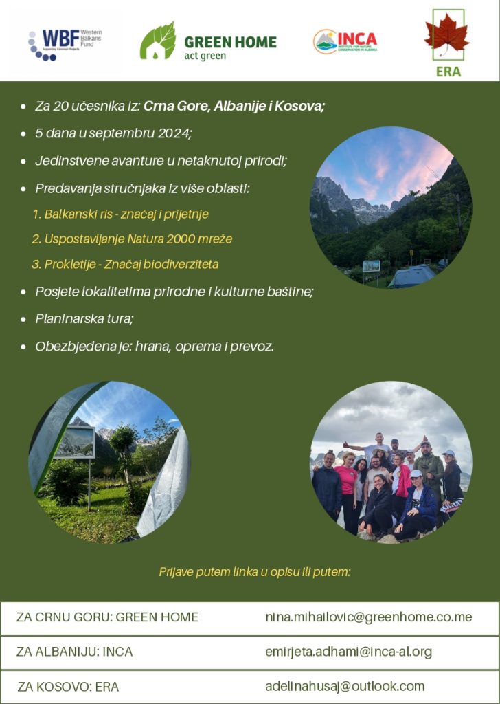 Kao i prošle godine, Green Home, u saradnji sa organizacijama INCA iz Albanije i ERA sa Kosova organizuje petodnevni ekološki kamp koji će se održati u podnožju Prokletija, u dolini Grebaje, od 09. do 13. septembra 2024. godine, za studente iz Crne Gore, Albanije i Kosova.